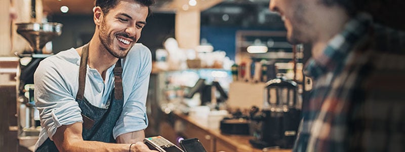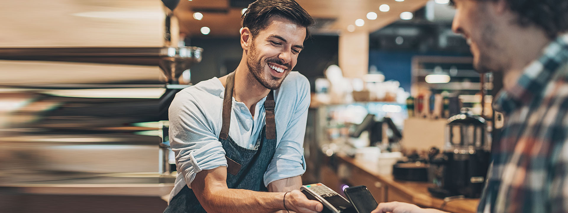 Hombre sonriente recibiendo un pago contactless Hombre trabajando recibiendo un pago contactless