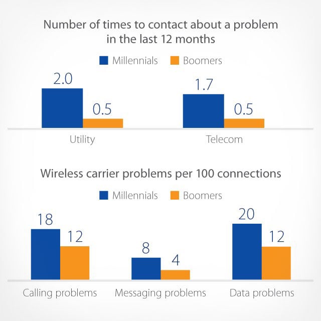 In addition to the desire to self-serve via digital channels, millennials have higher service standards and a heightened sensitivity to negative service experiences. In fact, millennials are more likely than Baby Boomers to report problems with service, as illustrated by data from the telecom industry4.