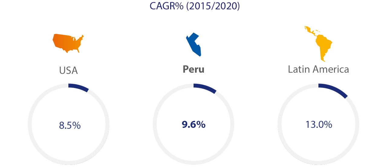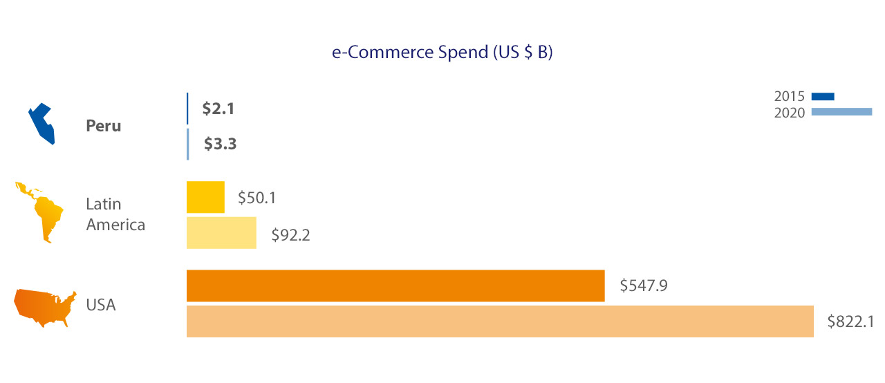 In 2015, the total e-Commerce spend in Peru reached US $2.1 billion, and is predicted to grow 9.6% annually through to 2020, reaching $3.3 billion.