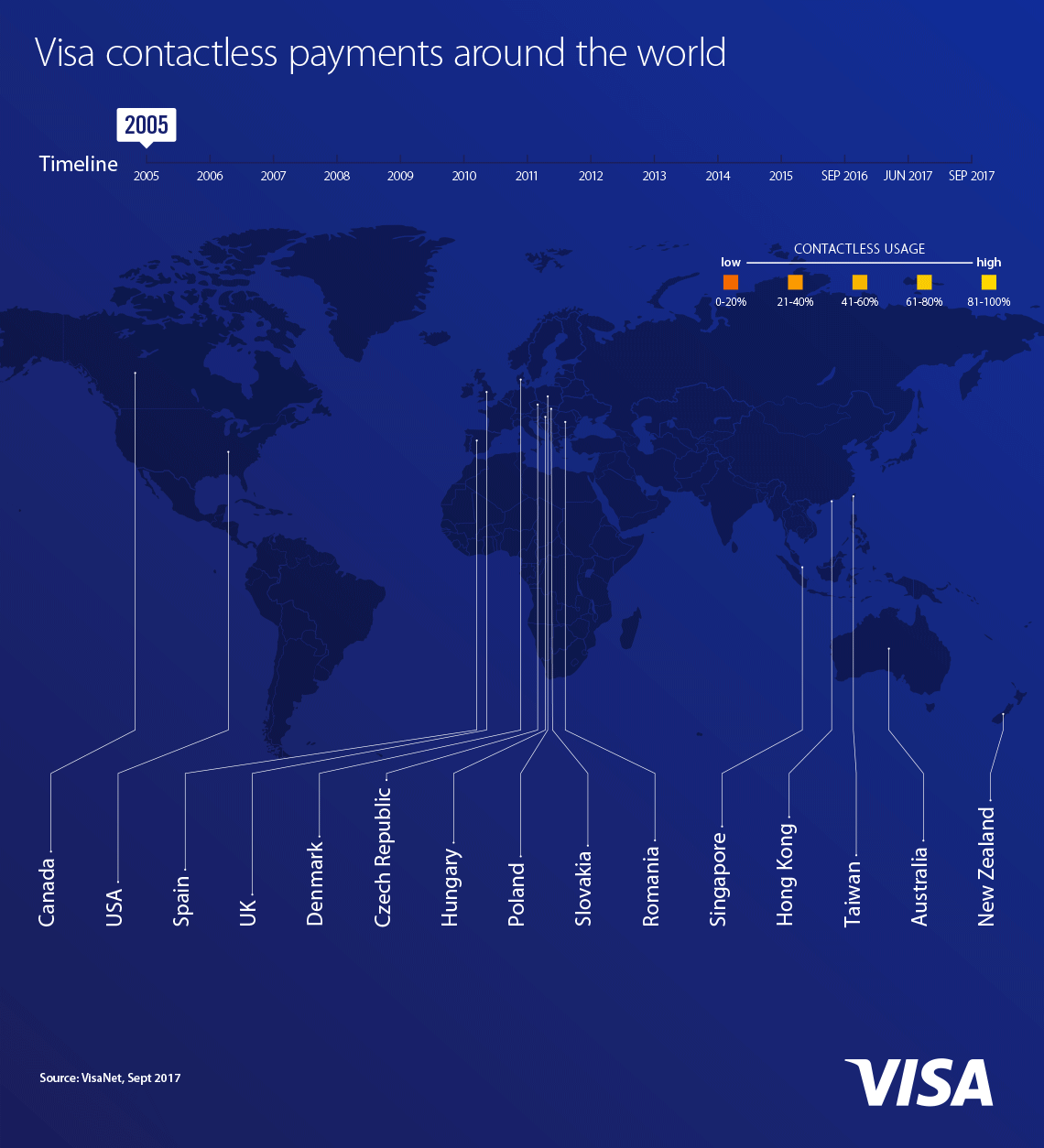 Contactless payments, where you simply tap to pay with a contactless card, payment-enabled mobile or wearable device at a contactless-enabled checkout terminal, are taking parts of the world by storm. As the U.S. prepares to accelerate adoption of this fast, simple and secure way to pay, we looked at its exponential growth globally. Our map and the numbers show a clear sign of what's to come: By the end of 2018, Visa projects 50 percent of face-to-face transactions will occur at contactless-enabled merchant locations in the U.S. Here, we look at how the future of contactless payments looks bright across the globe.